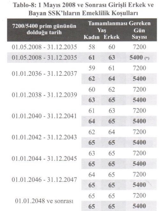 1 Mayıs 2008 milat kabul edilerek emeklilik sisteminde köklü bir reforma gidildi. Bu tarihten sonra ilk defa sigortalı olan çalışanların tam emekli olabilmesi için temel kural 7200 prim gününü (20 yıl) doldurmaktır. Yaş haddinden (kısmi) emeklilik için ise 5400 prim günü (15 yıl) gerekmektedir. Prim şartlarının tamamlandığı tarihe göre uygulanacak emeklilik yaşı da kademeli olarak artış göstermektedir.